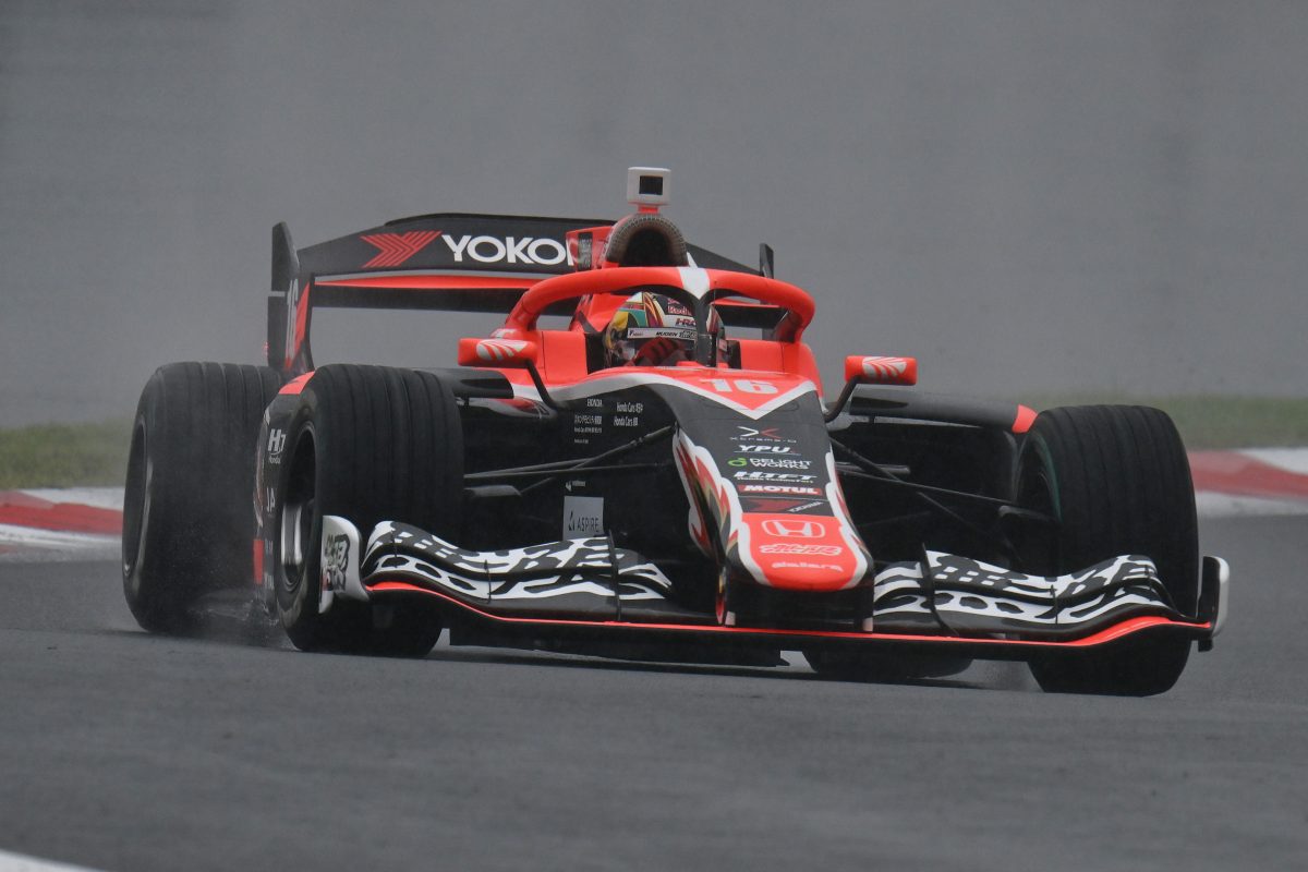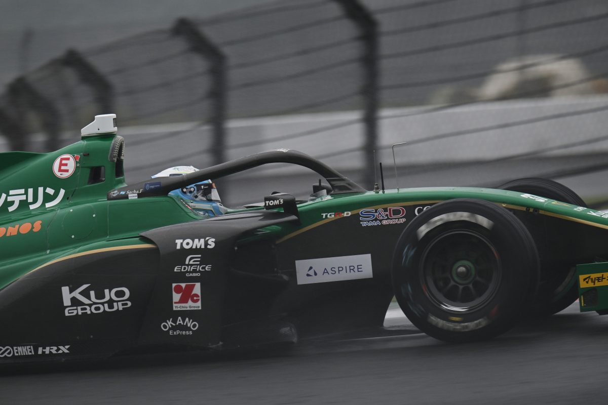 5分間のインターバルを経て、同じく10分間で争われるBグループのQ1が始まったのは、午前10時25分。今回、Bグループに振り分けられたのは、坪井、山下健太(KONDO RACING)、太田、小林可夢偉(Kids com Team KCMG)、Juju(HAZAMA ANDO Triple Tree Racing)、野尻、高星明誠(ITOCHU ENEX WECARS TEAM IMPUL)、野中誠太(KDDI TGMGP TGR-DC)、大湯、小出峻(San-Ei Gen with B-Max)、イゴール・オオムラ・フラガ(PONOS NAKAJIMA RACING)の11人だった。セッションが開始される頃になると、一旦止みかけていた雨が本格的に降り始め、路面の水の量も増え始める。そんな中、ピットロード出口がオープンされると、太田を先頭に野尻、坪井、フラガ、山下といった順でほとんどのドライバーがレインタイヤを装着してコースに入っていく。一方、可夢偉と高星は、開始から1分半ほど待ってから、やはりレインタイヤを装着して、コースに入って行った。Aグループと同様、ここからは誰もピットに戻ることなく、周回を重ねていく。この中で、まずトップに立ったのは、1分35秒248というタイムを刻んだ可夢偉。これに太田が続く。しかし、坪井が1分34秒478というタイムをマークして、セッション半ば、残り時間が5分となったところでトップに立った。さらに残り時間が4分となったところでは、山下が坪井を上回る1分34秒476をマークしてくるが、各車この翌周にはさらにタイムアップ。可夢偉が1分33秒996と、33秒台に入ったのを皮切りに、太田が1分33秒833、野尻が1分33秒636、坪井が1分33秒486、山下が1分33秒326と、目まぐるしくトップが入れ替わっていく。さらに、その翌周、残り時間が1分半ほどとなったところでは、野尻が1分32秒993と、いよいよ32秒台に突入。これに続いて、山下が1分32秒907をマークして、この時点でのトップに立った。そして、いよいよチェッカー周。野尻はここで1分32秒905と、山下のタイムを1000分の2秒上回ってくる。さらに、最後のアタックで大きくタイムを伸ばしたのが坪井。坪井は、チェッカーを受けると同時に、1分32秒725というタイムを叩き出した。その後、坪井のタイムを上回ったドライバーはおらず、坪井はトップでQ1を突破。野尻、山下、最後のアタックでタイムを上げた太田、フラガ、大湯までがQ1を突破している。一方、残念ながらQ2に駒を進めることができなかったのは、小出、可夢偉、高星、野中、Jujuとなっている。