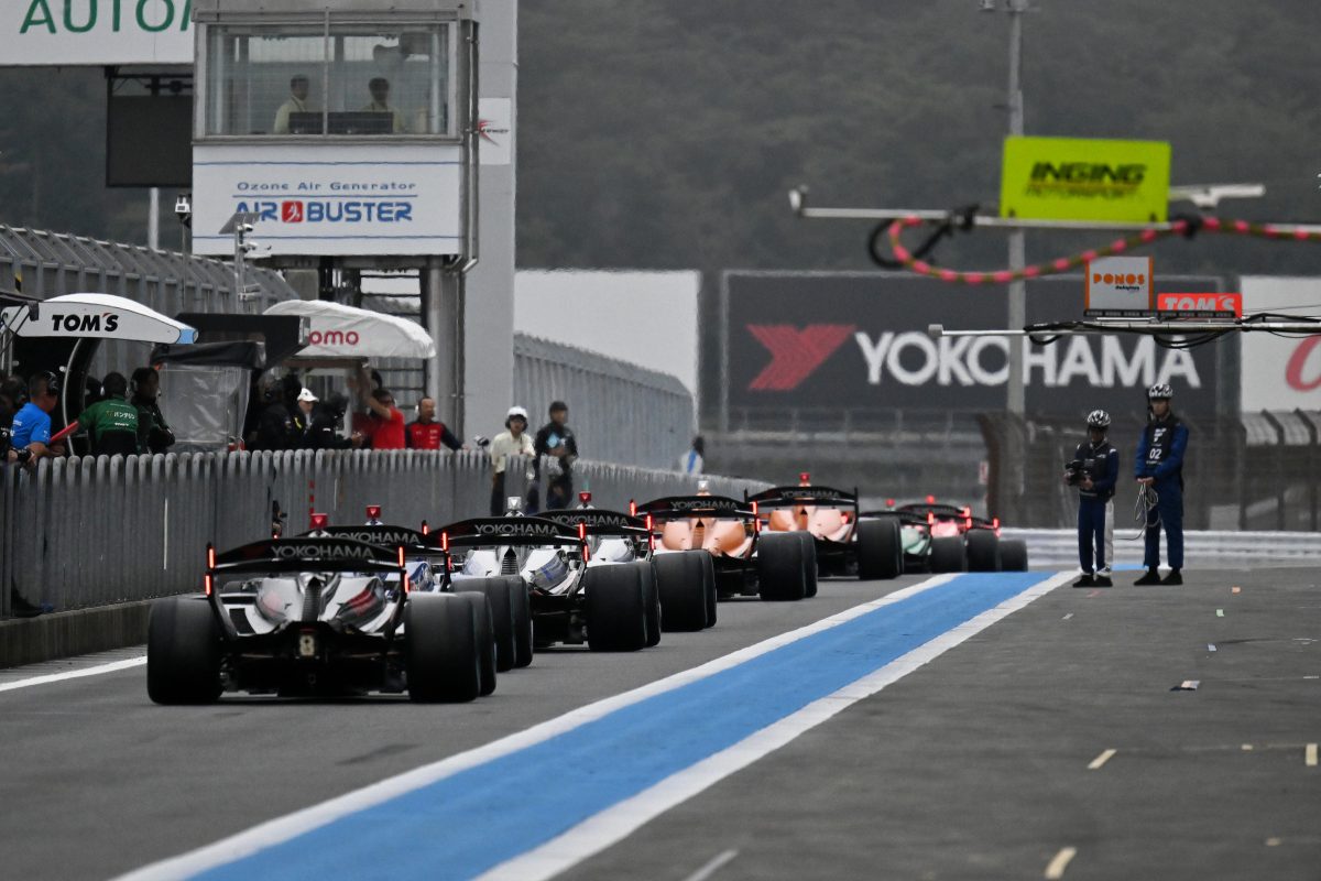 前日には雨が降り続いた富士。しかし、早朝にはその雨も止み、午前9時頃からは次第に気温が上がり始めた。しかし、風が余りなかったため、路面はなかなか乾かない。ノックアウト予選、10分間で争われるAグループのQ1が始まった10時10分の段階でも、ダンプコンディションとなり、競技団はWET宣言を出していた。昨日の第9戦の結果を受けて、今日の予選でAグループに振り分けられたのは、ザック・オサリバン(KONDO RACING)、牧野、福住仁嶺(Kids com Team KCMG)、Juju(HAZAMA ANDO Triple Tree Racing)、大嶋和也(docomo business ROOKIE)、岩佐、高星明誠(ITOCHU ENEX WECARS TEAM IMPUL)、野中誠太(KDDI TGMGP TGR-DC)、サッシャ・フェネストラズ(VANTELIN TEAM TOM’S)、阪口晴南(SANKI VERTEX PARTNERS CERUMO・INGING)、フラガの11人。気温20℃、路面温度23℃というコンディションの下、ピットロード出口がオープンされると、牧野、岩佐、フェネストラズ、福住、フラガ、阪口といった順でほとんどのドライバーがまもなくスリックのニュータイヤを装着してコースインしていく。しかし、オサリバンだけは、ピットから出てこない。結局、オサリバンは、エンジンハーネスの問題で、エンジン始動することができず、最後までコースに出ることが叶わなかった。その他のドライバーたちは、最初からピットに戻ることなく、周回。残り時間が3分となったあたりからアタックラップに入っていく。ここで真っ先に1分22秒759というタイムをマークしたのは、牧野。これに続いて、フラガが1分22秒793をマーク。2番手に浮上してくる。その後も、続々とアタックラップを終えたドライバーたちがコントロールラインを切るが、22秒台に入ったものはおらず、牧野はトップでQ1を突破。フラガがこれに続いた。3番手には福住。以下、阪口、岩佐、そして最後の最後に自己ベストをマークした大嶋が6番手に滑り込む。ここまでがQ1を突破することとなった。一方、大嶋とわずか1000分の26秒差で7番手だった高星をはじめ、野中、アタックラップ前の周に100Rでスピンを喫したフェネストラズ、Juju、そして全くコースに出ることなく終わったオサリバンは、Q2に駒を進めることができなかった。