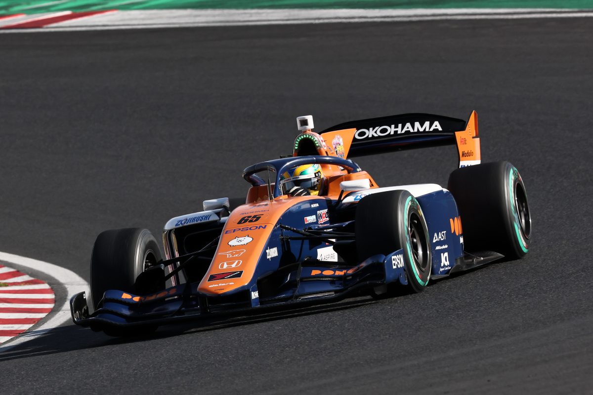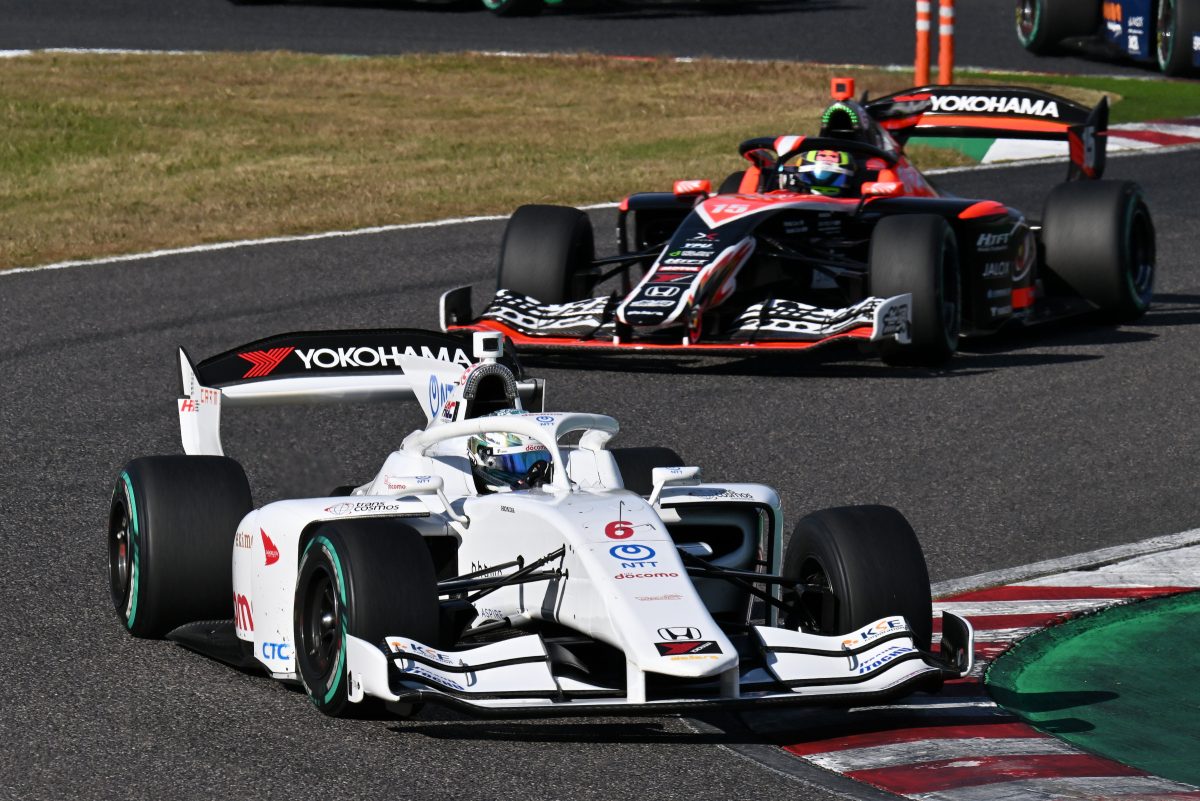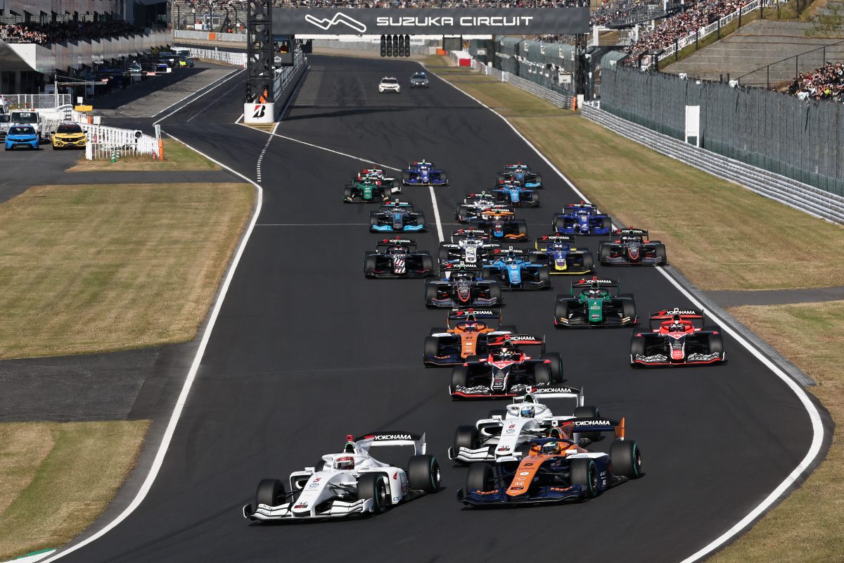 連休中日となる23日も、鈴鹿は朝から空が晴れ渡り、絶好の行楽日和となった。風もほとんどなく、気温が16℃、路面温度が20℃まで上昇。そのコンディションの下、午前9時50分には第10戦のフォーメーションラップがスタートした。昨日はハプニングがあったが、このレースでは全車が無事に1周の隊列走行を終え、正規グリッドに着く。それを確認すると後方ではグリーンフラッグが振られ、シグナルオールレッドからブラックアウト。ここでフロントロウの牧野とフラガは、いい蹴り出しを見せたが、加速はフラガの方が良かった。そこで牧野はフラガを牽制すべく、イン側にラインを振る。しかし、目の前を塞がれる形となったフラガは即座にアウトにラインを振ると、そのまま加速。1コーナーの進入手前では、左側のタイヤを若干芝に落としながらもアウトから豪快に牧野をオーバーテイクしてみせた。この2台に続いたのは太田、岩佐歩夢(TEAM MUGEN)、野尻智紀(TEAM MUGEN)、佐藤蓮(PONOS NAKAJIMA RACING)、坪井翔(VANTELIN TEAM TOM’S)、大湯都史樹(SANKI VERTEX PARTNERS CERUMO・INGING)、福住仁嶺(Kids com Team KCMG)、大嶋和也(docomo business ROOKIE)。阪口晴南(SANKI VERTEX PARTNERS CERUMO・INGING)と小出峻(San-Ei Gen with B-Max)はスタートで少しポジションを落としている。