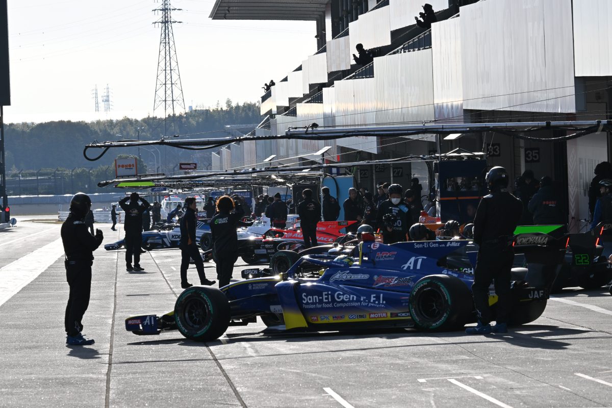 2時間半のインターバルを経て、合同テスト最後のセッション4が始まったのは、午後1時45分。セッション3の間は空に雲が広がったりという時間帯もあったが、この最後のセッションは再び陽射しに恵まれた。セッション開始時の気温は15℃、路面温度は20℃まで上昇。メインストレートは午前中に続いてほぼ無風だったが、時折弱い向かい風が吹いていた。このセッションは初日と同様、当初の予定よりも終了時刻を10分延長して、午後4時10分まで。最後の20分間は、全車を2つのグループに分け、それぞれ10分間、アタックシミュレーションをできる時間帯を設けている。さて、セッションが始まると、各車は続々とコースイン。それぞれ残るメニューをこなしていく。その中で開始から30分を前にして、赤旗が提示される。これはデグナーコーナー2つ目でコースアウト車両があったため。このマシンの回収が終わると、セッションは午後2時23分に再開。その5分後には、岩佐歩夢(TEAM MUGEN)が1分37秒680と、このセッションでは最初に37秒台に入ってくる。しかし、その直後、セッションは2回目の赤旗に中断された。これは、NIPPOコーナー立ち上がりで鈴木がコースオフしたため。このマシンの回収が終わると、セッションは午後2時39分に再開された。この再開後、ニュータイヤを投入してトップタイムを書き換えたのは岩佐。岩佐はここで1分37秒362と、自身の出していたタイムをコンマ3秒ほど上回ってきた。さらに再開から20分後、自己ベストを更新してきたのは、松下信治(DELiGHTWORKS RACING)。新チームとして初のテストに臨んでいる松下は、1分38秒742というタイムをマークし、この時点での5番手に浮上してくる。その5分ほど後には、福住が1分37秒918と37秒台に突入。さらに、その数分後には太田格之進(DOCOMO TEAM DANDELION RACING )もニュータイヤを投入して1分37秒965と、37秒台に突入した。その数分後、午後3時23分には、3回目の赤旗が提示される。これは荒尾創大(ThreeBond Racing)がアウトラップでハーフスピンし、S字コーナーイン側にコースオフしたため。このマシンの回収が終わると、セッションは午後3時29分に再開された。その再開から間もなく、牧野が1分37秒777というタイムをマーク。続いてフラガが1分37秒640、坪井が1分37秒726と次々に37秒台に入ってきた。そして、午後3時50分からの10分間は、昨日組み分けされた2グループのうち、グループ2に振り分けられたドライバーたちが、午後4時から4時10分はグループ1に振り分けられたドライバーたちが、それぞれ10分間に渡って最後のアタックを行う。その中で、佐藤が1分37秒576、太田が1分37秒381と自己ベストを更新。さらに、牧野がそれまで岩佐の出していたトップタイムを上回る1分37秒319を叩き出す。さらに、フラガが1分37秒358、坪井が1分37秒617、阪口が1分37秒956、山下が1分37秒514、サッシャ・フェネストラズ(VANTELIN TEAM TOM’S)が1分37秒911と自己ベストを更新してきたが、牧野のタイムには及ばなかった。しかし、チェッカーとともに一気にタイムアップし、トップに躍り出たのは福住。福住は各セクターで速さを見せて、コントロールラインを切った所で1分37秒221をマーク。2日目のセッションを総合トップで締めくくった。レギュラードライバー陣はこれで年内最後の走行を終了。次に走行するのは2月の合同テストということになる。