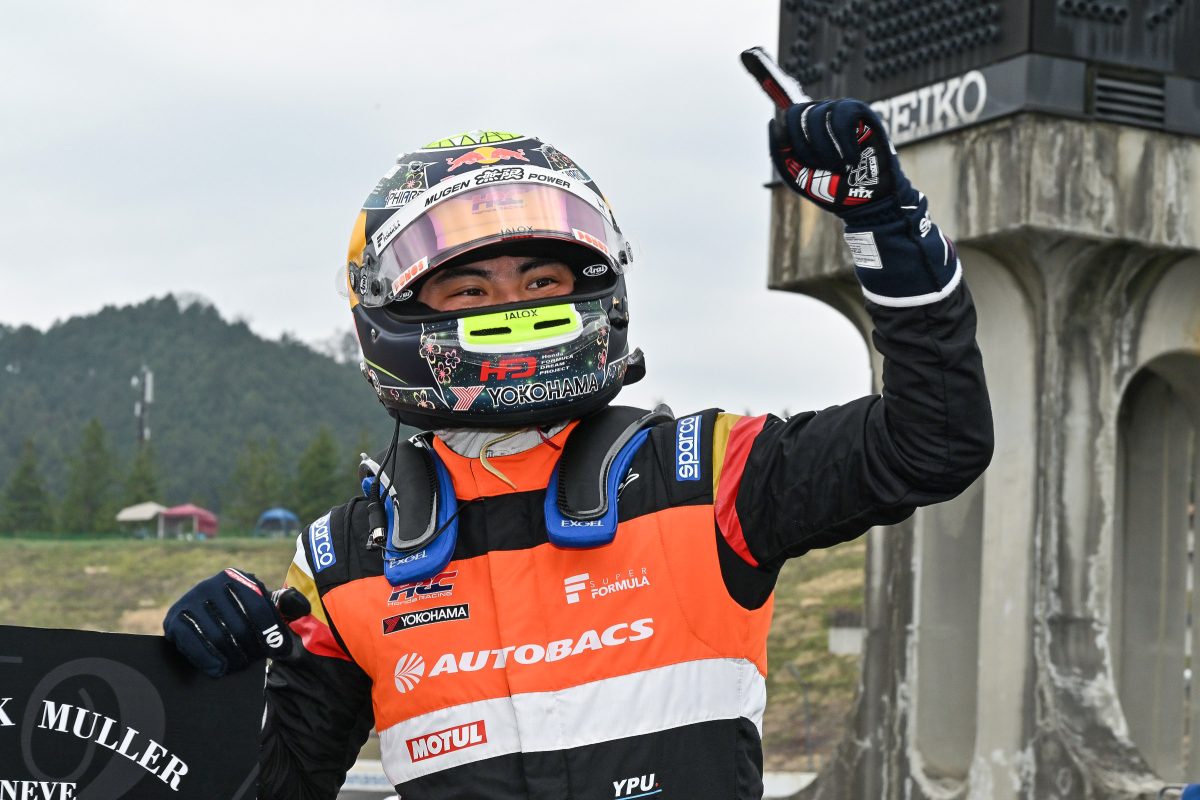春爛漫の天候となったフリー走行から一夜明けた、4月4日(土)の栃木県・モビリティリゾートもてぎ。早朝にはうっすらと陽が射す時間帯もあったが、その後は空が雲に覆われ、午前8時過ぎからはパラパラと雨粒が落ちる場面もあった。しかしその後雨は止み、コースの路面を濡らすこともなかった。そんな中、午前9時30分からは、全日本スーパーフォーミュラ選手権開幕戦のノックアウト予選が行われる。Q1、Q2を通じて激しいタイムアタック合戦が繰り広げられた結果、今季最初のPPを獲得したのはディフェンディングチャンピオンの岩佐歩夢(TEAM MUGEN AUTOBACS)。これに太田格之進(DOCOMO TEAM DANDELION RACING)、佐藤蓮(PONOS NAKAJIMA RACING)が続き、ホンダエンジン勢がトップ3を独占している。これに続いたのは、今季チームを移籍した福住仁嶺(NTT docomo Business ROOKIE)。福住がトヨタエンジン勢では最上位となったが、予選後の再車検で最低重量違反との裁定を下され、失格。代わって、今日がデビュー戦となるルーキーの野村勇斗(San-Ei Gen with B-Max)が4番手に食い込む健闘を見せている。